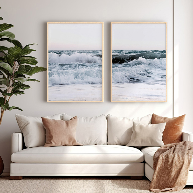 Let the power of the ocean and the salty breeze fill your space with a sense of freedom. The Kaleria diptych captures the evocative motion of waves crashing along the shore, with the horizon fading into the white of the sky. Each time you focus on the soft blue and white tones, you feel a sense of escape, deep tranquility, and renewal. The artwork celebrates natural beauty — a visual reminder that true luxury lies in the grandeur of nature.