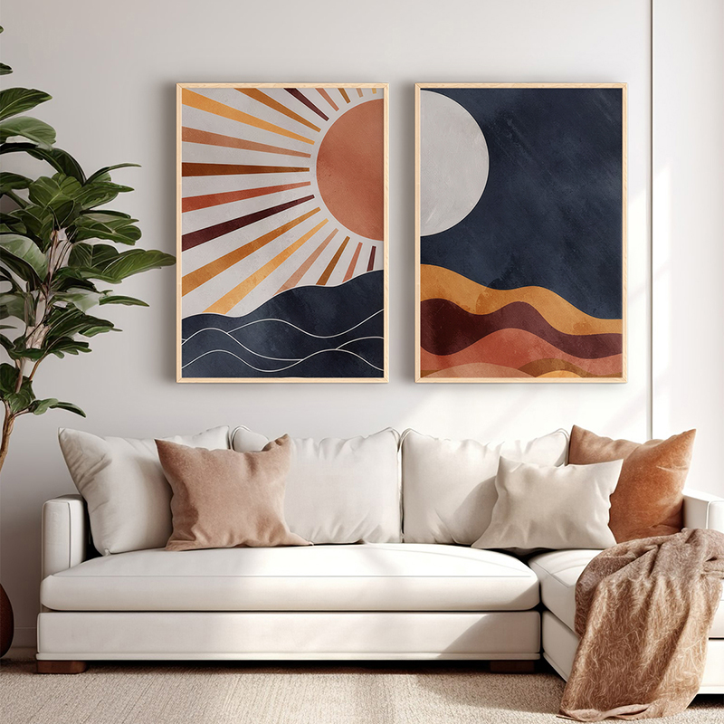 Bring the balance of the universe and the warmth of earthy tones into your home. The Pequa diptych depicts the eternal alternation of the Sun and the Moon over an abstract landscape of sand dunes. Every time your gaze rests on the clean geometric forms and dramatic, retro tones, you feel a sense of stability, balance, and spiritual uplift. The artwork symbolizes the cycle of life, duality, and the timeless charm of astronomy.