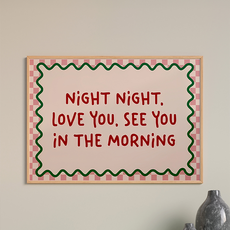 Create a warm, relaxing, and nurturing atmosphere, perfect for a nursery, child’s room, or even the bedroom, with the sweet Tharis wall art. This piece carries the tender message “NIGHT NIGHT. LOVE YOU, SEE YOU IN THE MORNING” in a charming retro font.