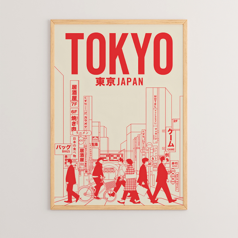 Bring a cosmopolitan and retro vibe to your space with the striking Tokia painting. This artwork serves as a vintage-style Travel Poster for the city of Tokyo. The design is dominated by bold red tones on a beige background, depicting the city skyline in a graphic, minimalist style.