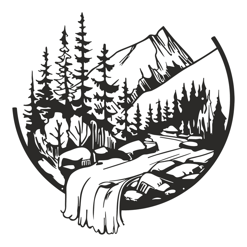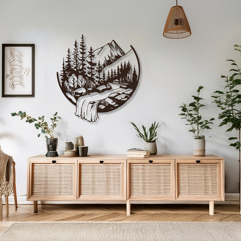Transform your wall into a window to nature with this unique, minimal metal decorative piece, Mordio. Carefully designed, it depicts a serene mountain landscape with fir trees and a waterfall “overflowing” beyond the circle’s boundaries, giving your space a three-dimensional effect.